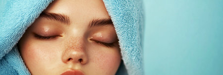 A girl rests comfortably with her eyes closed, wrapped in a soft blue towel. She embodies tranquility and relaxation in a soothing environment, banner