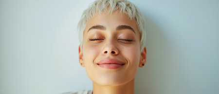Joyful woman with short bleached hair in light clothes on a white background color photo