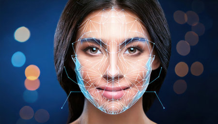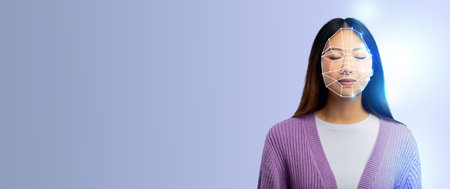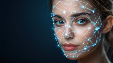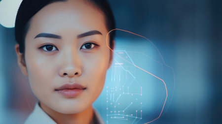 This image features a close-up portrait of a young woman with a digital facial recognition overlay, capturing the intersection of beauty and advanced technology in a modern setting.