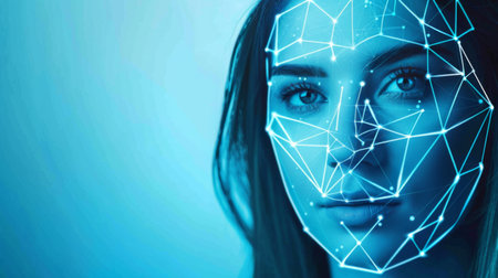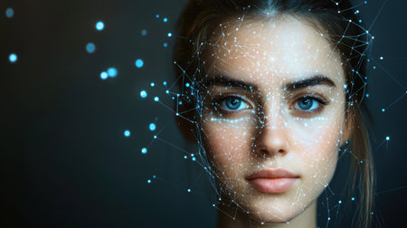A captivating image of a young woman's face highlighted by a geometric pattern of luminous lines and dots, symbolizing the fusion of technology and human identity.