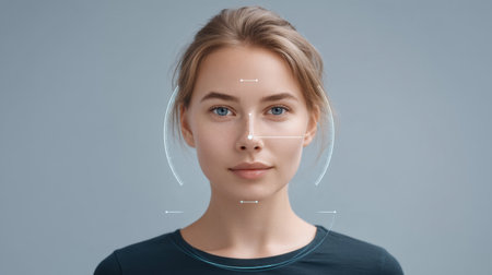 This image features a young woman with a neutral expression, enhanced by digital overlay technology for facial recognition. The soft gray background emphasizes her natural beauty.