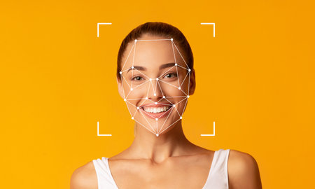 Smiling woman highlights facial recognition tech against a vivid backdrop