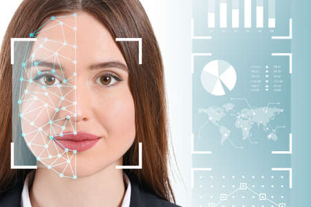 Face recognition technology concept. Woman face scan. Biometric verification.