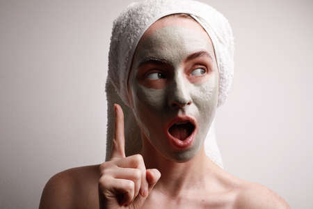 Shot of beautiful young woman look aside with finger up gesture clay facial mask, wrap towel on head. Beauty concept.