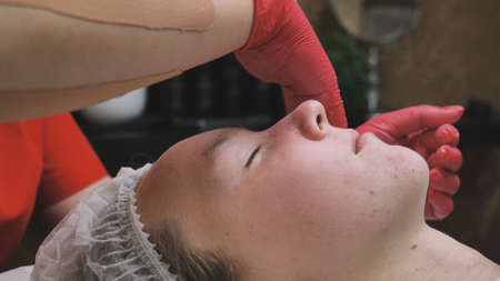 Paraffin Face Mask gauze bandage Therapy Young Woman Receiving Facial Skin Care Treatment. Beautician Pouring Wax Applying.
