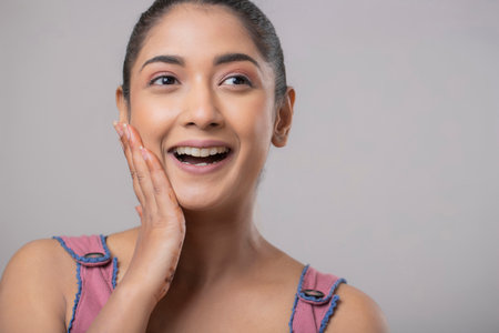 Portrait of a Happy Woman with Radiant Skin on a Gray Background Highlighting Skincare Facial Treatment. Concept Beauty Photography, Skincare Routine, Portrait Session, Professional Makeup