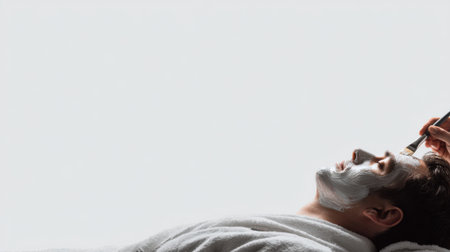 A man is lying down with his eyes closed, receiving a facial treatment. The focus is on his relaxed face and the application of a mask.