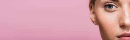 cropped view of beautiful woman with freckles isolated on pink, banner