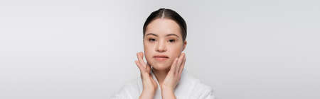 Young model with down syndrome in bathrobe touching face isolated on grey, banner