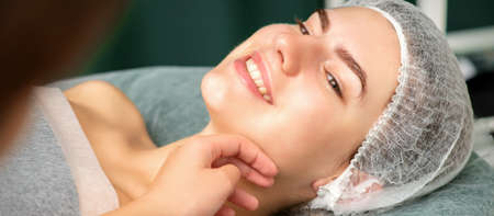 Plastic surgery and beauty concept. Hand of beautician examining and touching the face of beautiful young smiling caucasian woman