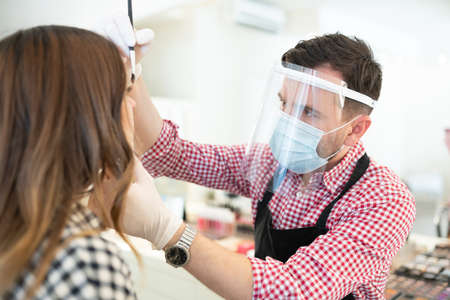 Male makeup artist wearing face shield and mask while applying eyeshadow on female client