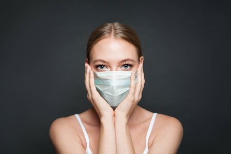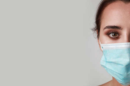 Close-up banner of young woman using medical mask. Stay safe. Pandemic situation. Space for text.