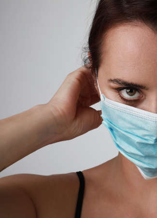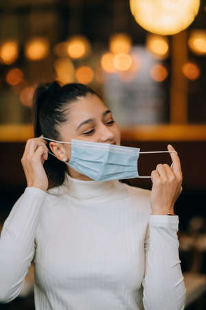 Vertical close-up of young woman using medical mask. Stay safe. Pandemic situation.