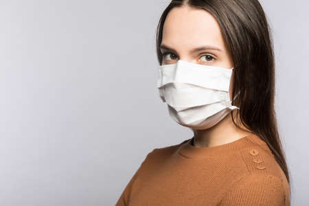 Serious brunette posing in studio with antivirus mask