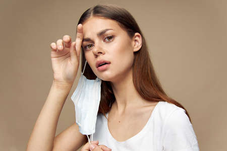 Girl in takes off her protective medical face mask