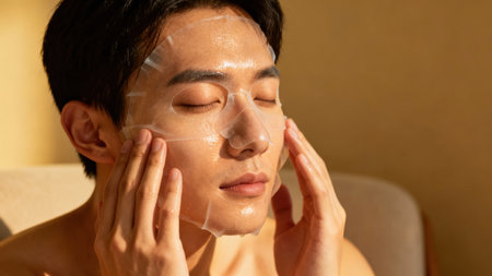 Handsome East Asian person receiving moisturizing treatment through clear facial sheet mask while glowing in strong, side-angle warm light.