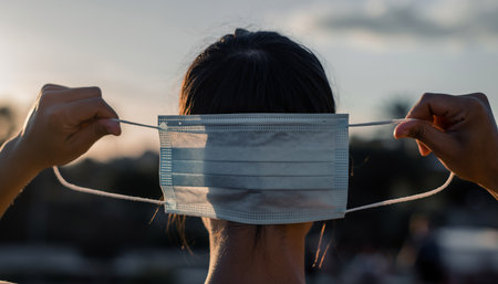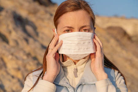 Woman putting on a medical mask in the sunset. Coronavirus concept.