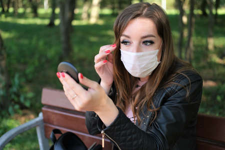 Girl in medical mask is resting on a bench in a park. Concept coronavirus, air pollution, rest