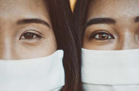 Group of asian girls going out after quarantine during coronavirus period. Young women outdoor with safety masks