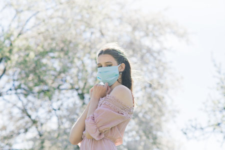 A girl in a protective medical mask in the spring among the blooming garden. . Spring allergy and covid concept.
