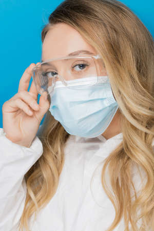 Concept fashion beauty young caucasian woman doctor nurse in surgical mask and glasses on pink background