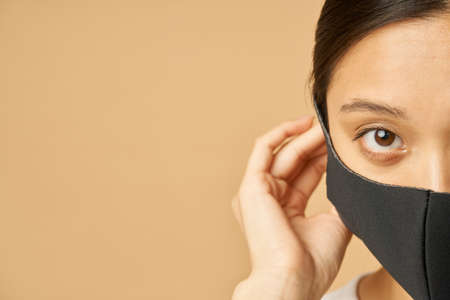 Half face shot of young woman putting on black facial mask, staying safe while posing isolated over beige background