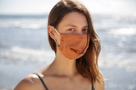 Woman with protective mask on the beach. Summer vacation after Coronavirus pandemic crisis.