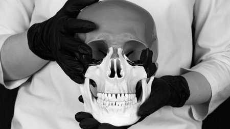 plaster skull in the hands of a doctor in black gloves in black and white style