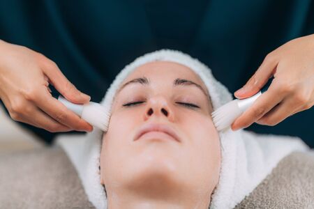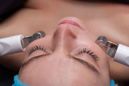 Young woman receiving electric galvanic anti-aging face spa massage at beauty salon. Galvanic massage helps to speed up metabolism, improve regeneration and restore skin protection from harmful external factors.