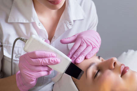 closeup, professional beautician, using an apparatus for ultrasonic face cleaning, cleans the skin of a girl patient, in a beauty salon. Master in cosmetology portrait