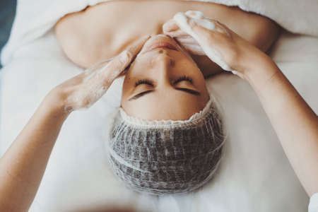 Beautiful woman getting facial skincare treatment in a cosmetic beauty clinic