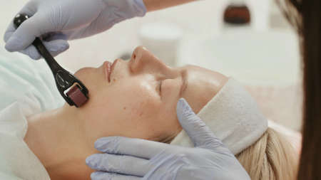 Close-up portrait of woman having beauty skin treatment. Therapist preparing skin with derma roller.