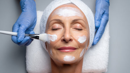 A close-up of a smiling mature woman with her eyes closed, receiving a white cream facial mask applied by a therapist in blue gloves.