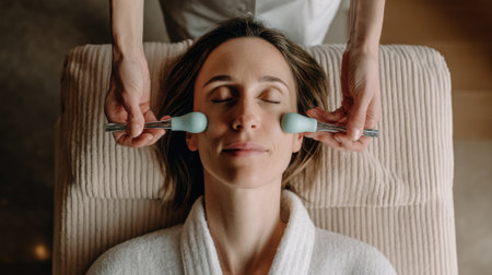 A woman lies on a massage table, eyes closed, enjoying a facial treatment with ice globes applied to her cheeks.