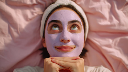A young woman with a purple face mask and a white headband looks up dreamily while resting on pink, textured bedding.