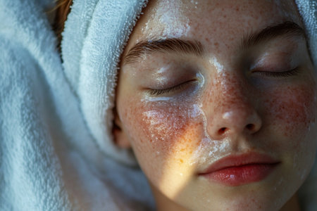 A girl with closed eyes rests peacefully with a facial mask on her skin, wrapped in a towel while experiencing a serene morning at home