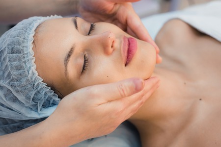 Young woman having anti-stress facial massage in salon at spa resort. Face massage. Facial skin care. Woman at beauty spa salon.