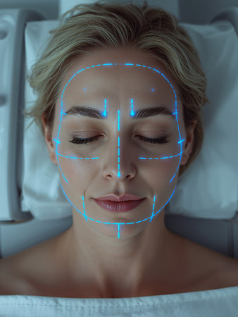 A middle-aged woman is lying with closed eyes and blue lines marking her face. These surgical markings indicate preparation for a cosmetic procedure or facial analysis.
