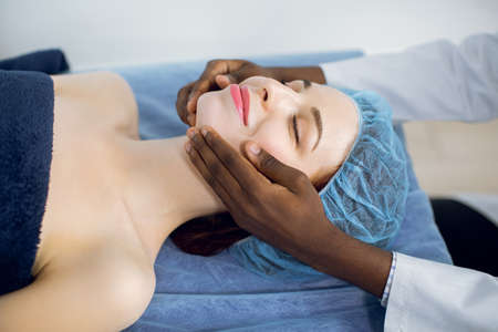 Relaxing treatment in medicine. Caucasian woman in disposable cap, lying on the couch, enjoying facial massage with closed eyes in spa salon or clinic. Hands of male black chiropractor doing massage