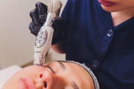 Beautician touching forehead with equipment for micronutrient treatment