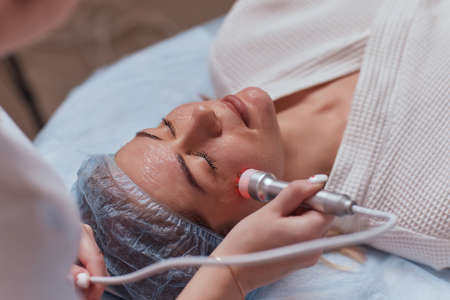 Woman patient relaxing during the ultrasonic facial treatment conducted by a cosmetician in sterile gloves