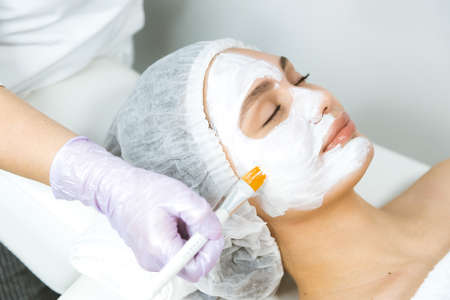Facial cosmetic procedure in spa salon. The procedure for applying a mask to the face of a beautiful woman