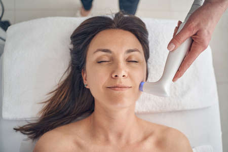 Mirthful woman lying on soft towel and smiling with closed eyes while a cosmetologist touching her face with a low level laser hand probe