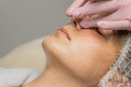 Doctor in gloves rubs the cream on patient face