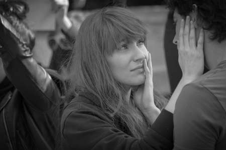 Girl with schizophrenia covering her ears to not hear the voice of her alter ego. Blurred person