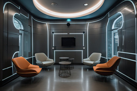 comfy lounge area, with futuristic decor and sleek furniture, for employees to relax during their workday, created with generative ai