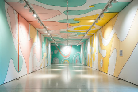 Colorful abstract mural in contemporary art gallery with soft pastels and curved patterns. That the image is generated using AI.