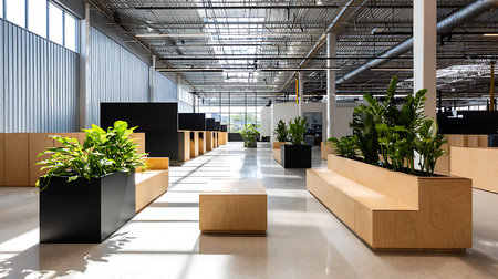 Explore a bright and modern office design featuring lush greenery and open spaces.