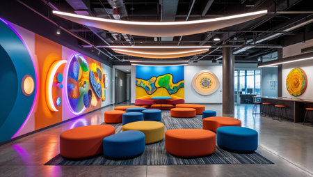 Discover a modern workspace showcasing vibrant wall art, comfortable seating, and an inviting atmosphere, perfect for collaboration and creativity in a professional environment.