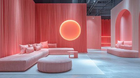 A contemporary interior design with arched furniture and bold red neon lighting, creating a stylish and futuristic aesthetic.